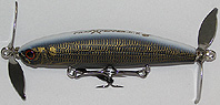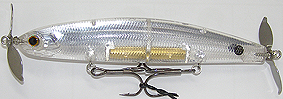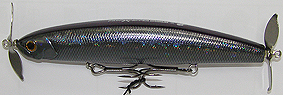 | メーターUP!のシーラがもっと簡単に釣れるように!と改造したバージョン! 着水しただけでもヒットする事もあるが、シンキングの為、着水後、5〜10秒ほど沈めた後、ロッド を下げ2〜3回続けてキュッ!・・キュッ!キュッ!っとアクションを付け1秒ほど止める! ヒットしないようなら同じ事を繰り返す。 もう一つの方法としては着水後スグにロッドを立て糸ふけを取りプラグを水面まで浮かせ、リールを 巻かずにロッドを2〜3回続けてアオリ(ラインをムチのようにして!)水面でプラグを暴れさせる! バシャバシャバシャッとやったら1秒ほど間隔を空けて繰り返す!すると・・・・・プラグの後ろに・・・・ドンッ! とシーラの頭が現れ・・・・ジョーズのように追尾が始まり・・・・ガボッ!・・・・ガボッ!・・・・・ガボッ!・・ドンッ! と食い付いて来る! 毎年夏の時期に少量だけ作られる、釣れ過ぎ注意!プラグなのです! |