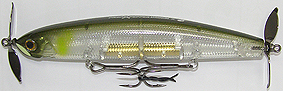 | 伝説のトップウォーター、レッドペッパーマグナムをウエイトチューン。 着水後、ジャーキングで水面下を左右にダート。 ティップを上げてアクションをつければトップで使え、さらにタダ引きをすると、水面下で引き波を 立てながらウオブリングします。 他の色々なルアーで叩いた後でもこのルアーだけには反応する不思議な力を秘めている・・・・ オフショアだけでなくシーバス用ビッグペンシルとしても有効。 |